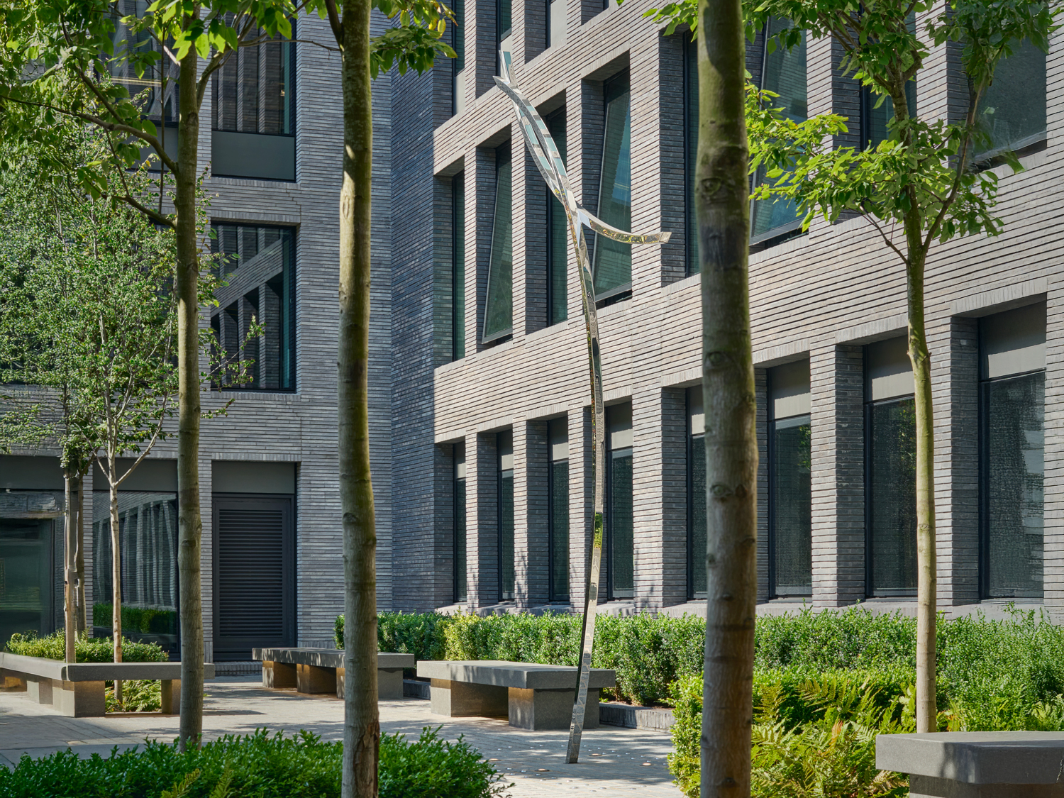, a meticulously crafted steel sculpture harmoniously inhabits a small park in central London